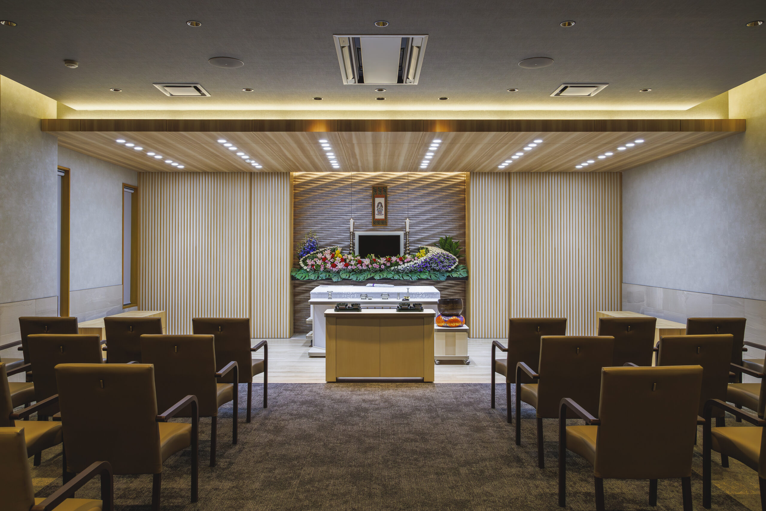 ベルモニー会館三島別館にある家族葬専用のホールです。ホール内にはフラワーアレンジメントの祭壇をご準備できる約30名様まで参列可能な葬儀式場と親族控室がございます。式場と控室の一部が襖で仕切られており、ホール内の行き来もしやすく故人様とのお時間を落ち着いて過ごせる安心の空間となっております。