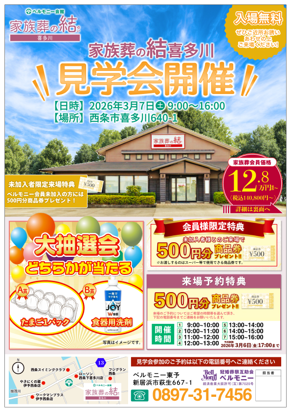 互助会東予エリア 2026.03.07 日時 2026年03月07日(土)〜 場所 家族葬の結 喜多川 時間 9:00~16:00 このイベントに申し込む TEL0897-31-7456 メールでのお申込みはこちら 一覧に戻る