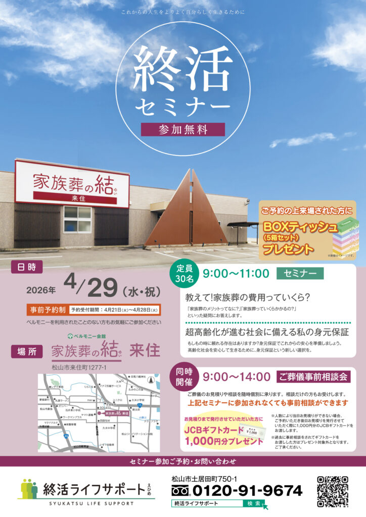 | 備考 | ※「終活マイスターカード」終了のお知らせ この度、皆様にご利用いただいておりました「終活マイスターカード」は、 誠に勝手ながら2026年12月31日をもちまして取り扱いを終了させていただくことになりました。 現在カードをお持ちの方は、セミナー受講の際のスタンプ押印や、ランクに応じてお渡ししていたプレゼントに関しましては、2026年12月31日まで引き続き行わせていただきます。 ただし、現在お手持ちのカードのランクアップや再発行、新規入会受付に関しましては今後中止させていただきますことご了承ください。 何卒ご理解の程よろしくお願い申し上げます。 |